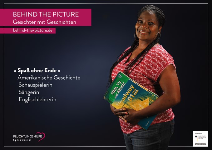 Schauspielerin, Sängerin, Sprachlehrerin - Roz Lewis führt ein vielseitiges Leben. Ihre Schauspielausbildung absolvierte sie im englischen Liverpool, trat in den USA und auf europäischen Bühnen auf. In Haßlinghausen sang sie bei Benefiz-Konzerten für die Flüchtlingshilfe. Auch als Sprachlehrerin unterstützt sie die Freiwilligen-Initiative. Nun ist sie auf dem 26. Plakat des Flüchtlingshilfe-Integrationsprojektes „Behind the Picture - Gesichter mit Geschichten“ zu sehen.